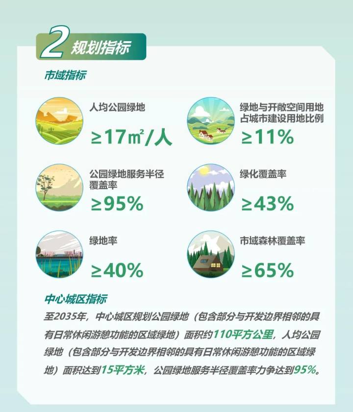 规划构建了“郊野公园-城市公园-社区(村镇)公园-游园(口袋公园)”四级城乡公园体系,至2035年,布局郊野公园30处,新增城市公园150处以上,新增老百姓身边的社区公园300处以上、游园(口袋公园)500处以上,实现“300米见绿,500米进园”的目标愿景。