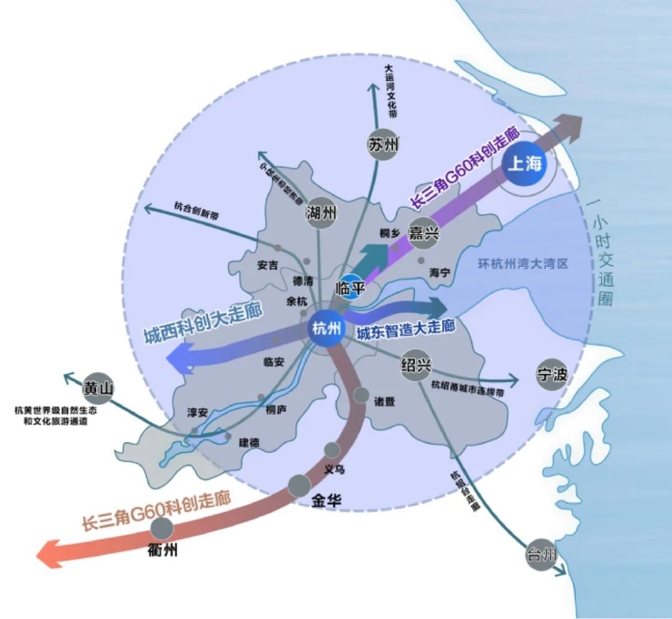 临平数智城地处长三角城市发展群核心,坐拥“一绕三射”高速路网、“四纵三横”快速路网,“两条高铁、四条地铁、两条城际线”在此交汇,半小时直达萧山机场、40分钟到达上海虹桥,更有京杭大运河、运河二通道组成的“黄金水道”,实现江海河联运。