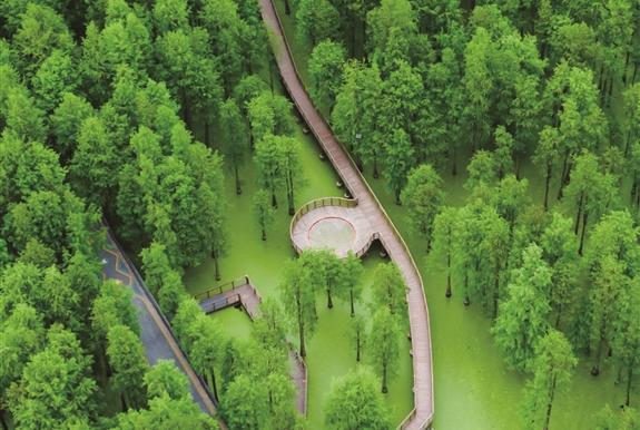 阳光明媚,一年一度的杭州临安青山湖“抹茶森林”又回归了。青山湖水上森林里,约5万平方米的1万多棵池杉和落羽杉笔直挺拔,郁郁葱葱,水面上铺满了绿色浮萍,像一块巨大的抹茶蛋糕。据悉,今年的青山湖“抹茶森林”为提前上线,这也是水上森林的湖面第一次在春季就形成“抹茶绿”,美景从4月底开始,将一直持续到11月左右,现在正是最佳观赏时间。