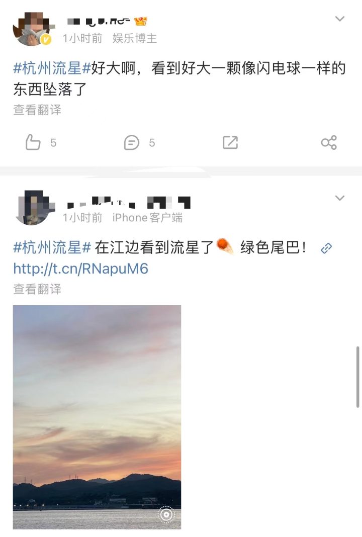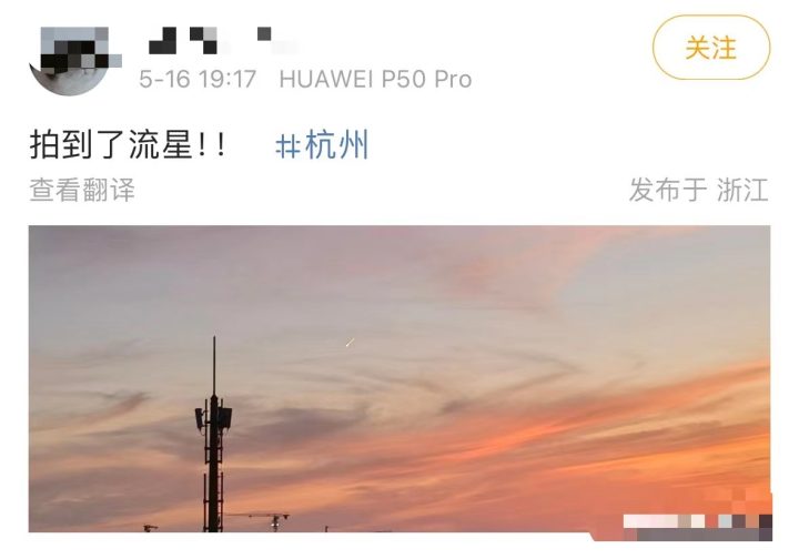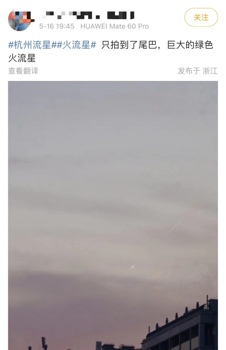 橙柿互动消息 今天傍晚接近7点的时候,多位网友称在杭州上空看到了流星。