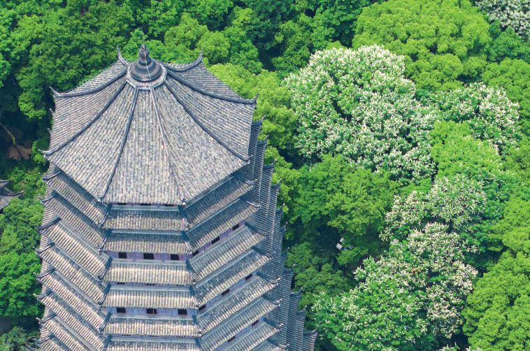 还有哪里可以见到七叶树?六和塔下。初夏的六和塔郁郁葱葱,满眼绿意,在浓密树荫间悄然钻出白色花簇,迎风摇曳,十分灵动好看,像一根根奶油棒冰。