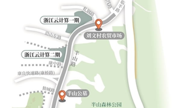 半山路(云锦路-高线路)东侧为杭州半山国家森林公园、西侧为大运河杭钢公园、北侧为由杭钢集团与阿里巴巴集团联合建设的浙江云计算数据中心。