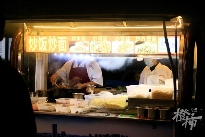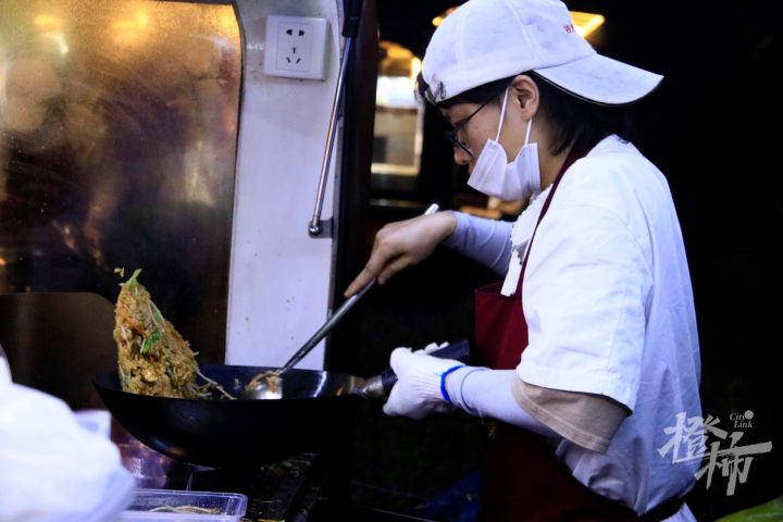 在每个摊位前,蒸、煮、煎、炸、炒等各类美食吸引周边居民和高校学子慕名而来,每家店铺前都排起了长长的队伍,为白杨城市夜间赋予了“生机”,也带动了惠民餐车摆放点各摊位营业额的提升。