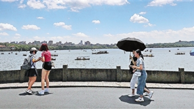 7月3日,在杭州西湖景区,烈日下的游人纷纷撑起遮阳伞。 本报记者 林云龙 摄