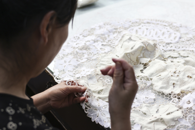 另一方面,作为萧山花边的龙头企业,中艺花边集团在转型升级发展智能化绣花业的同时,还继续致力于保护和传承传统手工“万缕丝”花边这一品种,企业提出“以新养老,以新养精”的方针,成立单独的工作部门,拨出专门的资金,保护老艺人,收购老产品,修复经典作品,建立花边陈列馆。