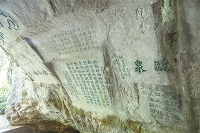 文人墨客在泉池周围岩壁上“跟帖”留言,写得密密麻麻,但由于时间久远,大多已被岁月侵蚀,现在能见到的基本是清末至民国的,如“天然琴声”“听无弦琴”“高山流水”“清乐梵音”等。