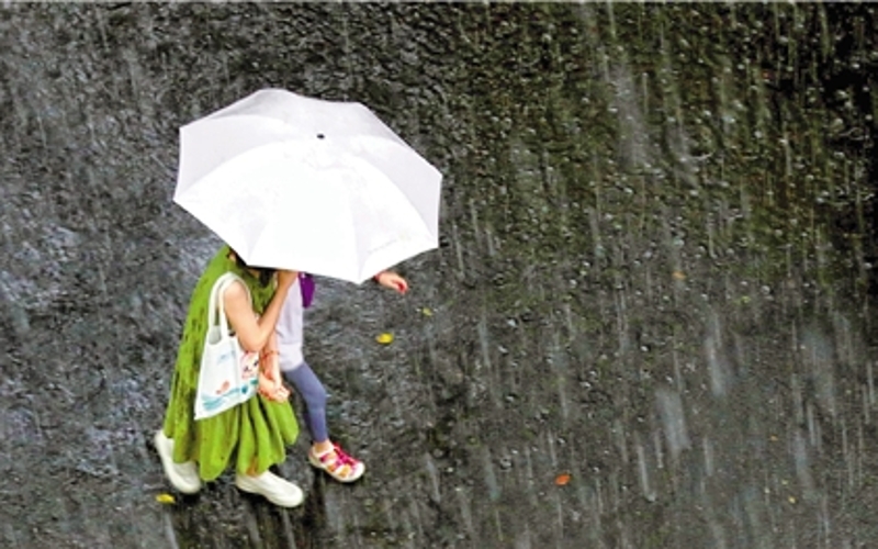 8月4日下午,杭城电闪雷鸣。图为在萧山区振宁路,市民冒雨前行。 记者 魏志阳 吕之遥 徐彦 摄