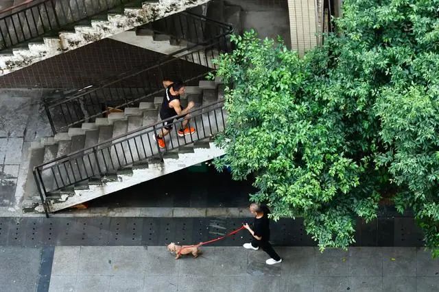 陈志刚(上)在小区内进行爬楼梯练习(7月10日摄)。新华社记者 沈伯韩 摄