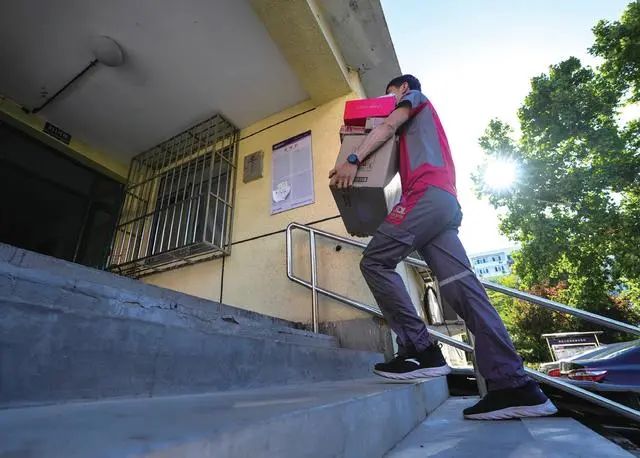 2024年6月24日,栾玉帅在北京市海淀区一小区派送快递。新华社记者 鞠焕宗 摄