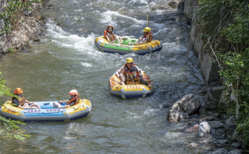 漂流融合隧道漂流和高落差激流漂流于一体,前半程穿越隧道相对平缓,后半程落差大比较刺激。沿途林木成荫、清新凉爽,乘坐皮艇于山野溪流中,时而急流澎湃,时而平缓如砥,整个景区绿树成荫,是一次回归大自然的惬意之旅。