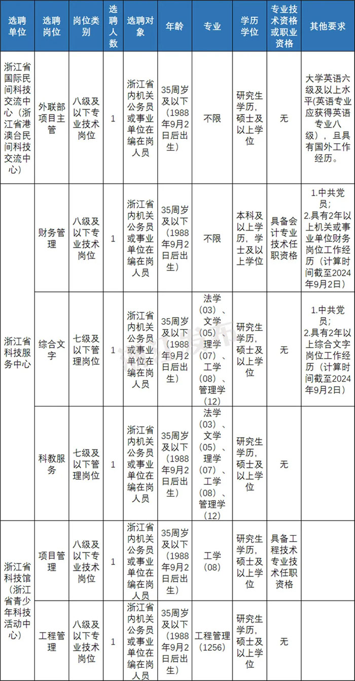 本次公开招聘1个岗位。本次选聘对象范围为浙江省内事业单位七级及以下管理岗位或十级及以下专业技术岗位在编在岗人员。
