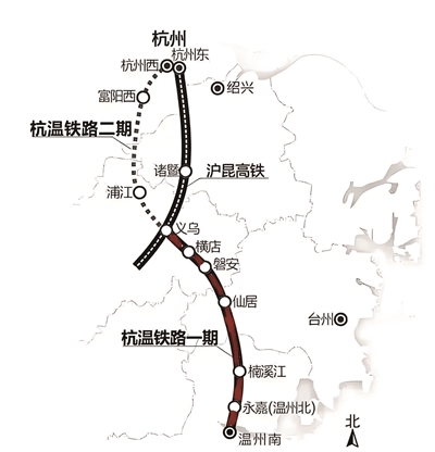 杭温高铁自杭州市桐庐东站引出,途经金华市、台州市、温州市,引入温州北站,通过既有杭深铁路延伸至温州南站。杭温高铁全线设桐庐东、浦江、义乌、横店、磐安、仙居、楠溪江、温州北、温州南等9座车站,正线全长276公里,设计时速350公里。