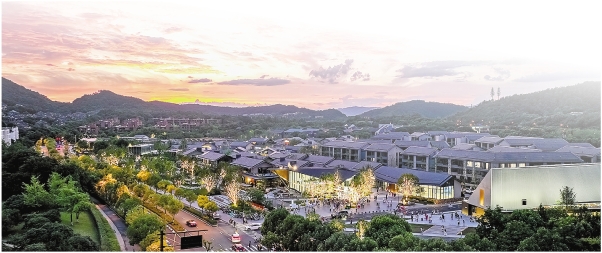 良渚文化艺术中心(大屋顶)及相邻的玉鸟集街区等,已经成了周边居民文化生活中必不可少的一部分。图为暮色中的大屋顶和玉鸟集街区。