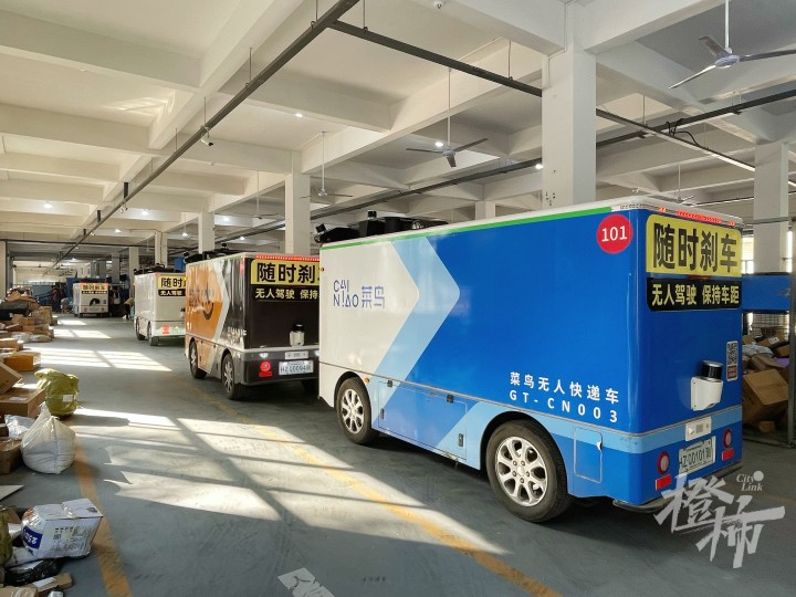 早在半年多前,网点负责人便试着采购了一批菜鸟快递无人车,用于网点到驿站之间的包裹配送。在双11之前,已有20多辆参与常态化运营,承担整个网点约55%的业务量。而临近双11,网点加大投入力度,使得车队规模达到30辆,成为眼下全国单一网点规模最大的无人车队。