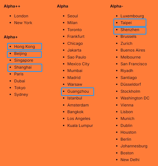 中国台北、深圳为Alpha-(世界一线弱城市)。