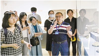 王征宇在吴越文化展览中向观众介绍考古情况