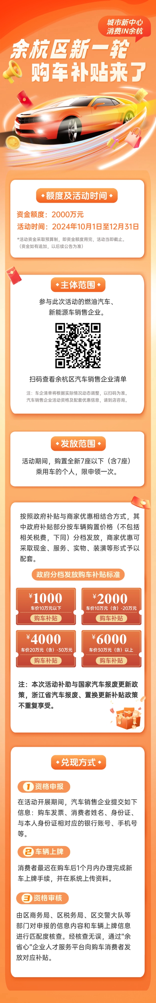10月1日至12月31日,余杭区将发放购车补贴,资金额度达2000万元。具体内容,一起来看↓↓