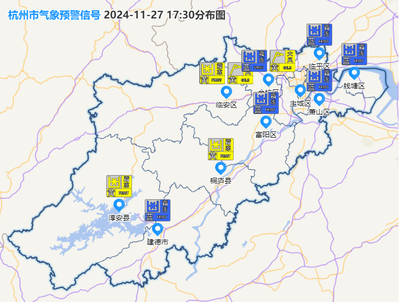 截至发稿前,杭州已有多个城区发布蓝色霜冻预警、黄色霜冻预警。