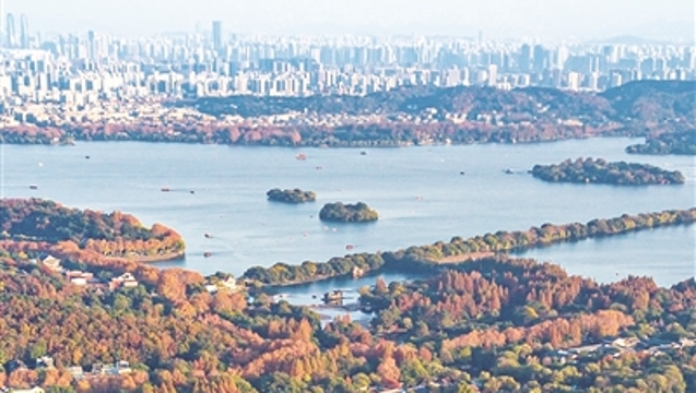 从杭州植物园附近上空俯瞰,湖山层林尽染,杭城五彩斑斓。 记者 陈中秋 摄