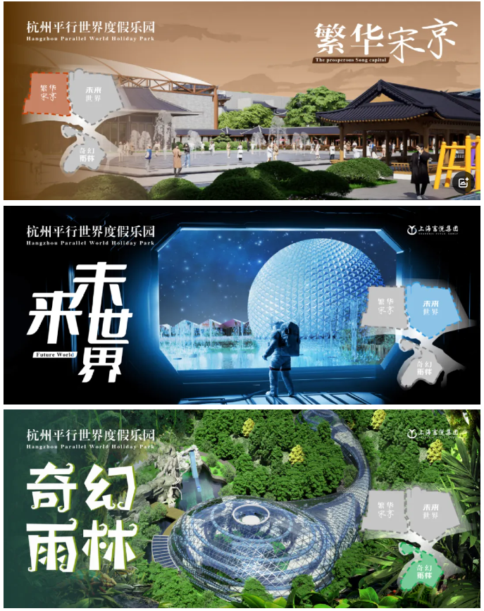 其中,杭州平行世界度假乐园分为“繁华宋京”“未来世界”“奇幻雨林”三大区域。以传奇宋韵到穿越未来的沉浸式体验为亮点,是一个设计超前、国内领先、体验性强的度假乐园。