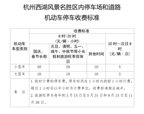 根据杭政办函〔2014〕101号文件规定,西湖景区政府定价停车场及道路泊位执行春节长假收费标准: