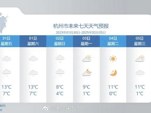 杭州市气象台预计,31日(初三)到2月2日(初五)以阴雨天气为主,其中31日(明天)下午到夜里有小到中雨,紧接着2日(初五)起冷空气南下影响,气温逐渐降低,2日下午起高山区局部有雨夹雪或雪。