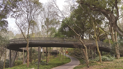 万松岭上,有一条栈道,名字叫“爱情诗路·白蛇飞渡桥”,入口在万松岭路89号附近,也可以从万松岭隧道西口南侧的石阶直接抵达。