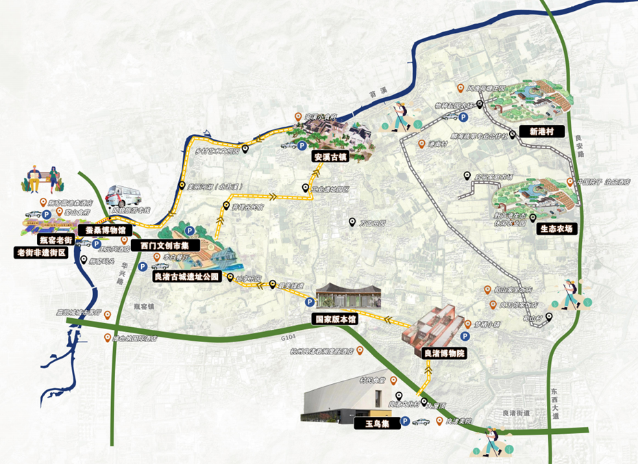 该游线以良渚古城遗址公园、国家版本馆以及良渚博物院为文化内核,以良渚最美文化绿道、省级美丽河湖东苕溪、万亩稻作农业为生态底色,串联良渚文化村、良渚博物院、杭州国家版本馆、良渚古城遗址公园、安溪古镇、瓶窑老街等特色景点,是一条薪火相传、弦歌不断的文明圣地之旅游线。
