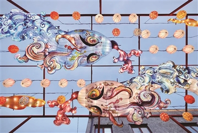 瓶窑老街的正大门,两条“灵蛇”已经盘旋在门柱上迎客。旁边的千年古城会客厅门口“长”出了“鱼”造型花灯,恰似辛弃疾词中的“一夜鱼龙舞”。