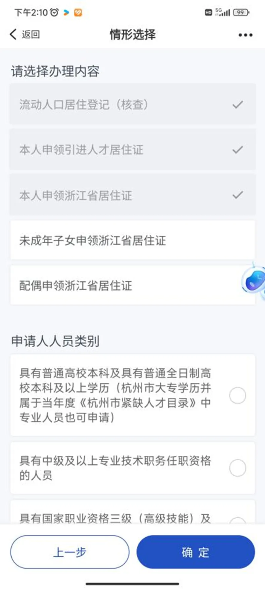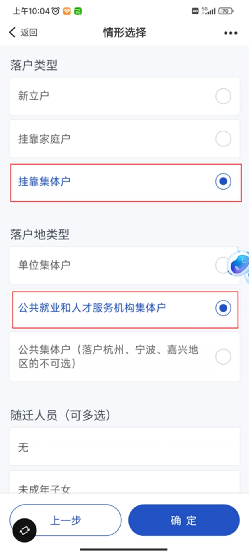 情形选择中,落户类型选择“挂靠集体户”,落户地类型选择“公共就业和人才服务机构集体户”,其余按个人情况选择。