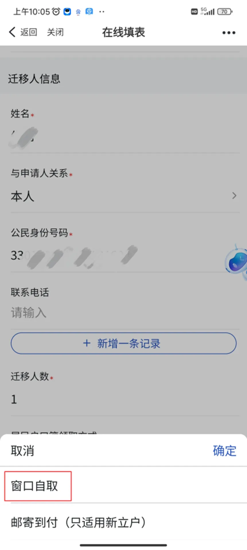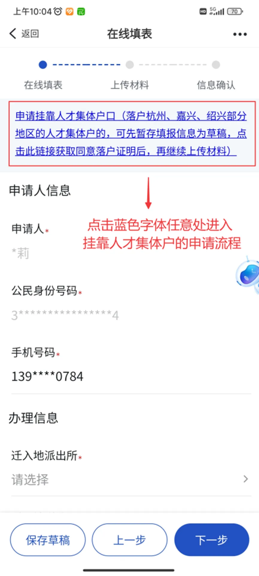 在线填表前点击蓝色字体进入挂靠人才集体户的申请流程,申请《同意落户证明》并下载文件后点击“返回”按钮至在线填表界面,其中迁入地派出所和迁入地详址按照《同意落户证明》上“集体户登记机关”和“集体户登记地址”填写;邮寄方式选择“窗口自取”。