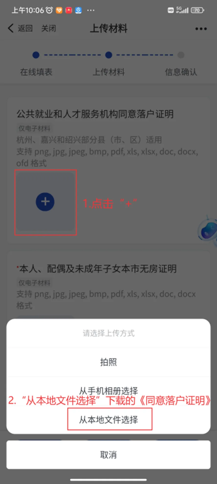 上传“公共就业和人才服务机构同意落户证明”的材料时点击“+”,选择“从本地文件选择”下载的《同意落户证明》,其余按要求上传材料。