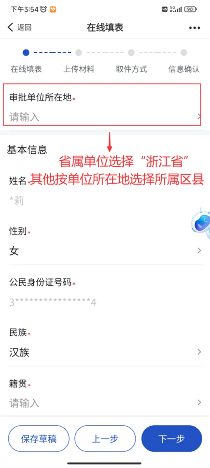 在线填表。按照真实信息填写,其中用人单位为省属单位的“审批单位所在地”选择“浙江省”,其他按单位所在地选择所属区、县。