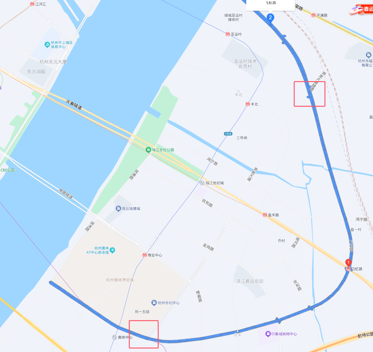 在地图上,飞虹路是一条弧形的道路,和奔竞大道相交了两次。