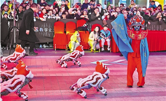2月12日,由省总工会主办的元宵游园灯会在杭州文三数字生活街区举行。来自宇树科技的人形机器人G1现场表演了川剧变脸绝活,还有16只身着红色舞狮服装的机器狗表演《金蛇狂舞》。这样富有科技感、互动性的元宵节活动,吸引了更多年轻人参与。