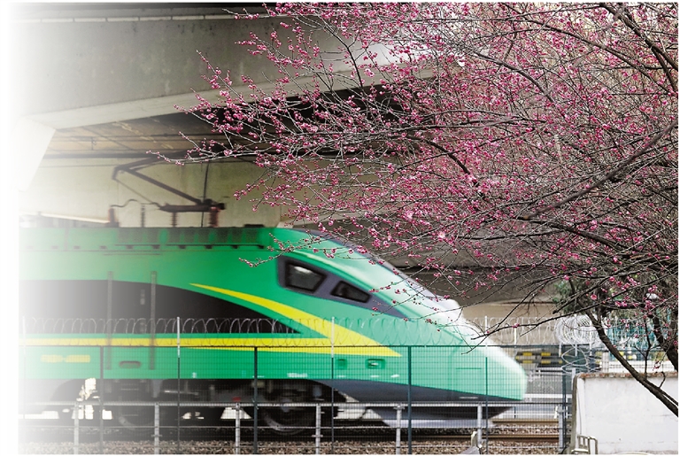 一列复兴号“绿巨人”动车从凤起立交桥下驶过,与路边几株嫣然绽放的红梅相互映衬,构成一幅充满诗意的画卷。杭州春天的脚步,也正悄然临近。