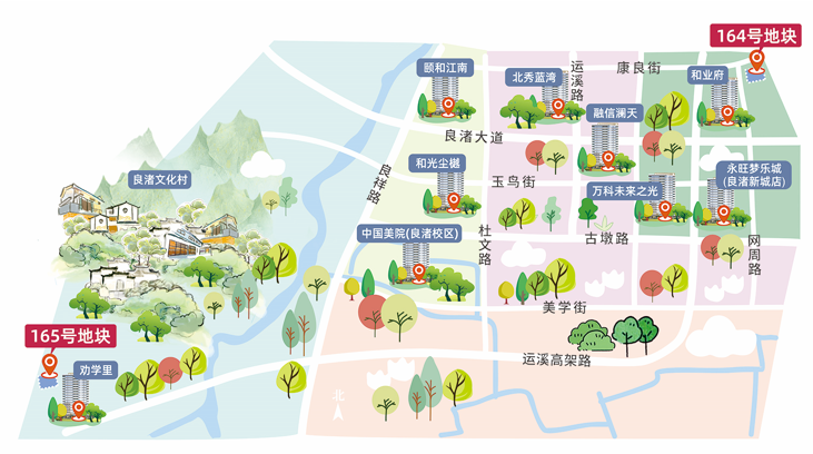 相比同处良渚辅城的165号地块,164号地块周边的配套设施丰富多了。