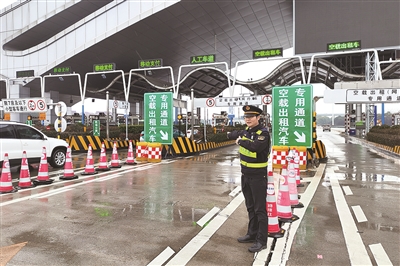 在机场公路主线收费站出机场这一方向,可以看见收费站内增设了“空载出租车”专用通道标识,并完善了电子查验和人工查验设备,以确保车辆通行的高效与顺畅。