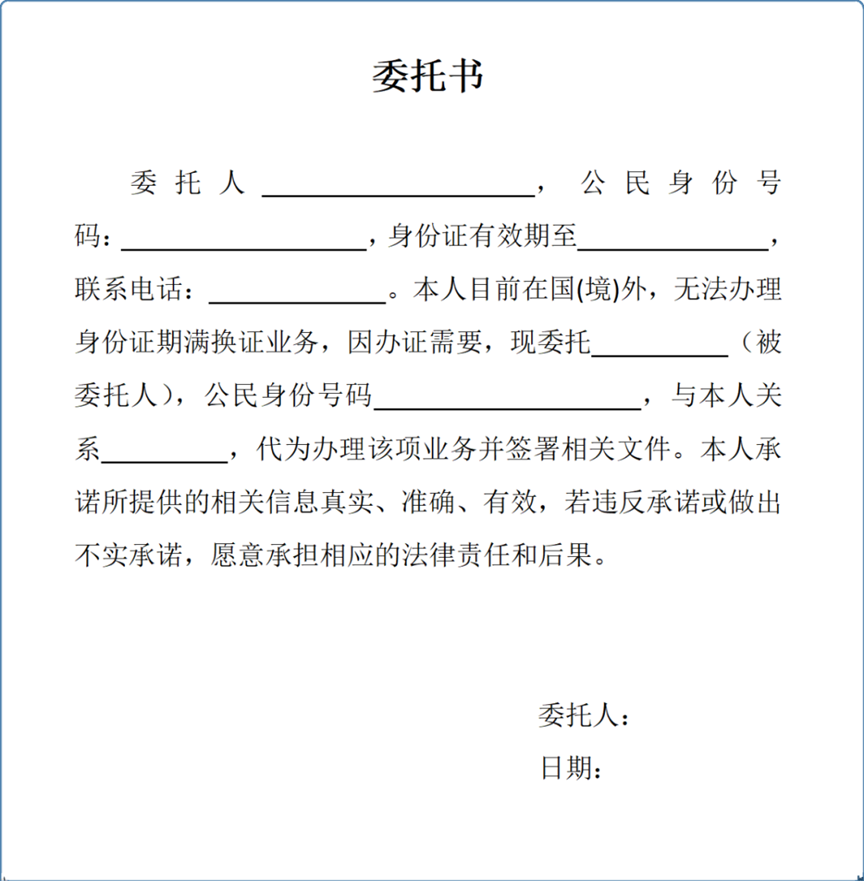 国境外身份证有效期满的,可待回国后在就近派出所窗口申请办理,也可委托国内近亲属去户口所在地派出所户籍窗口办理换领,所需材料: