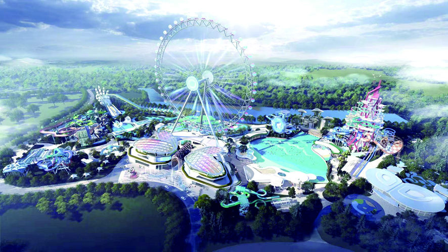 高达131.4米的巨型摩天轮是水世界工程的核心地标,131.4谐音“一生一世”,美好寓意体现了爱情、浪漫主题特色。摩天轮下方是蝴蝶形状的综合楼,根据建设方描述,项目园区内总建筑面积13454.07平方米,包括综合服务、餐饮及配套设施。