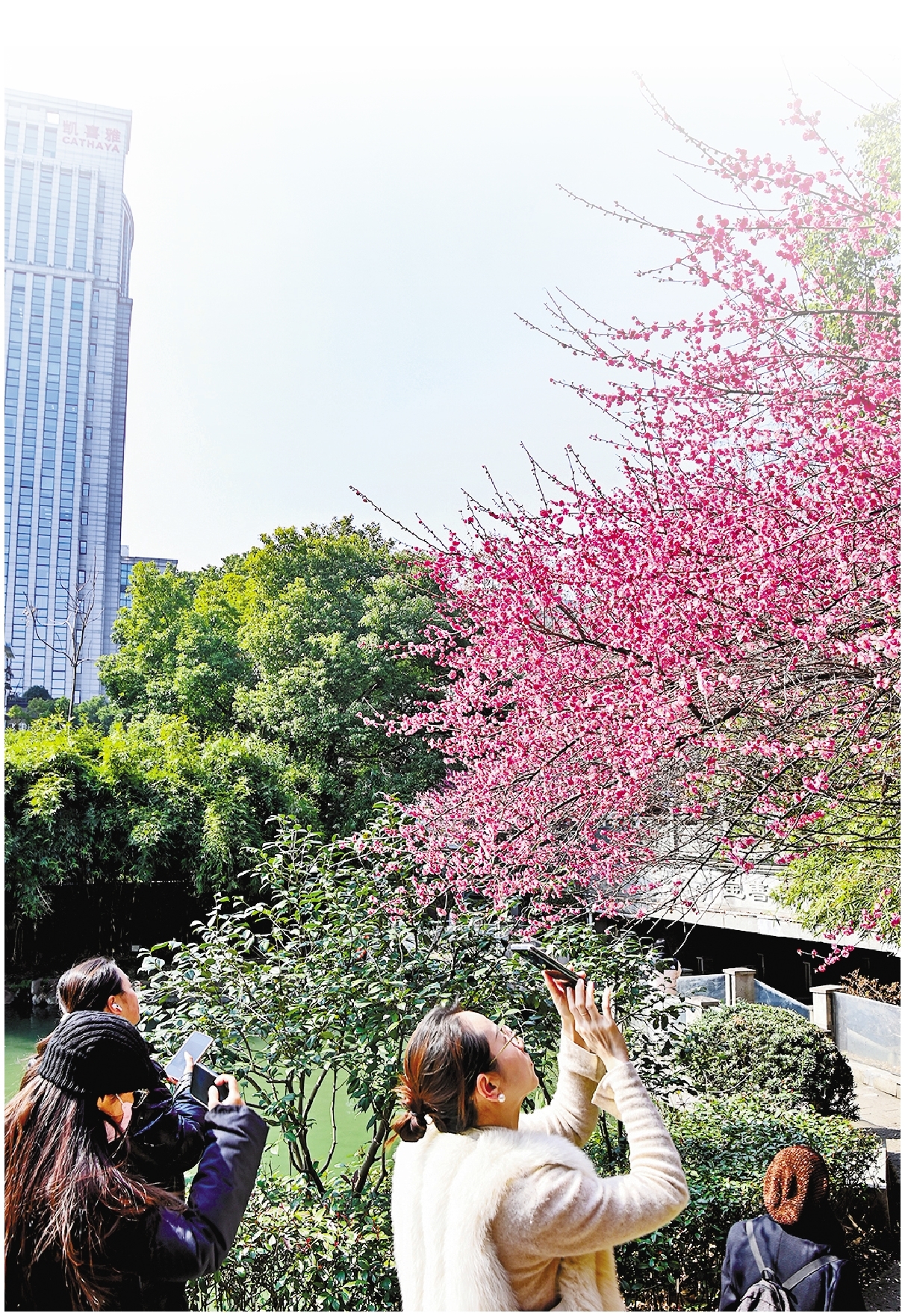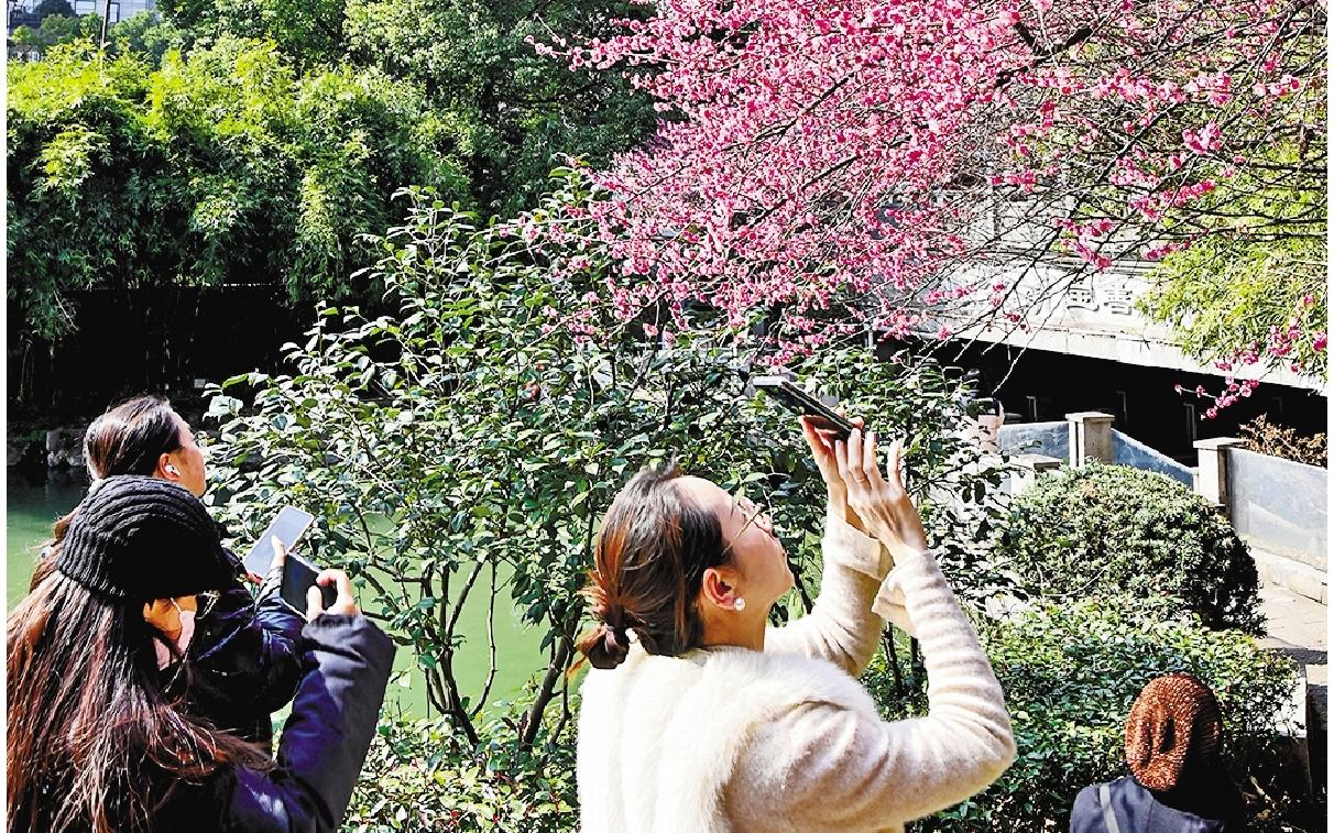 杭州东河沿岸的红梅迎来盛放期,吸引附近写字楼的员工在午休时间来此打卡、拍照。
