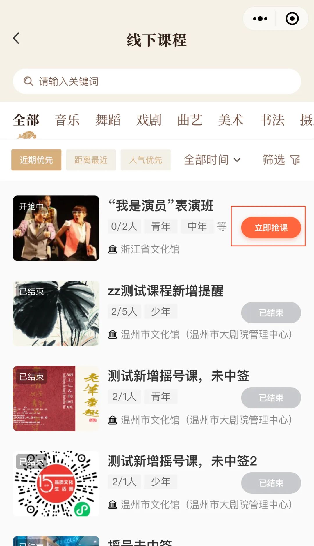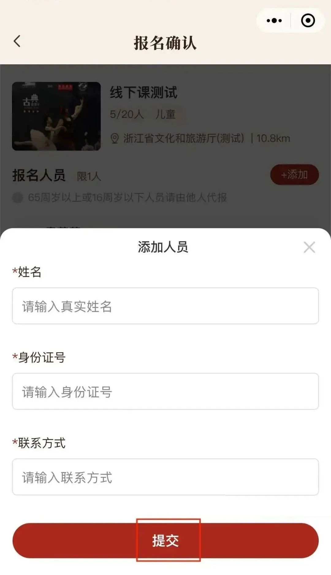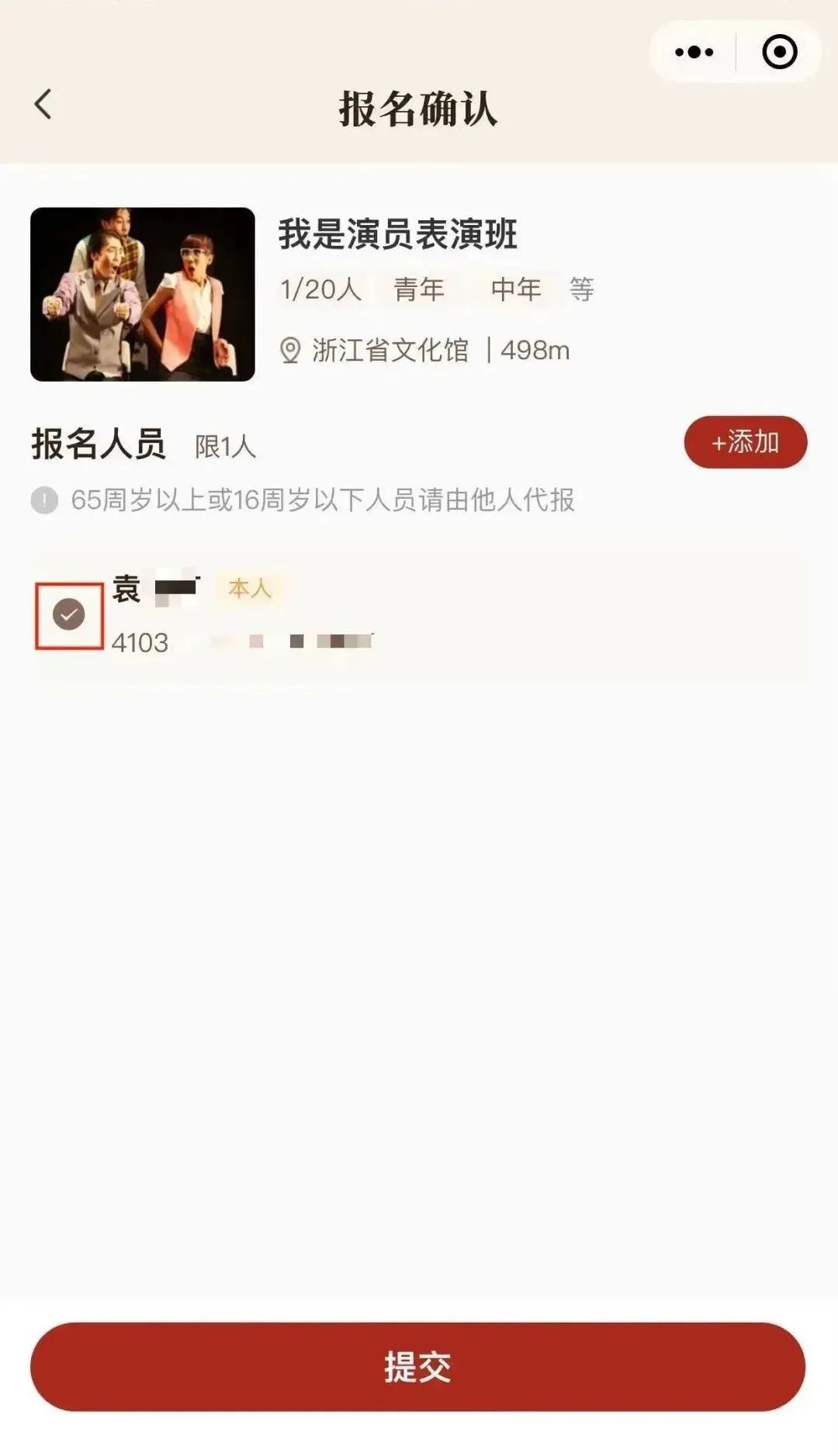 报名流程:微信小程序搜索“浙里文化圈”——点击“艺培”板块——“线下课程”——搜索或选择课程——点击“立即抢课”——添加身份信息——选择报名人员——提交