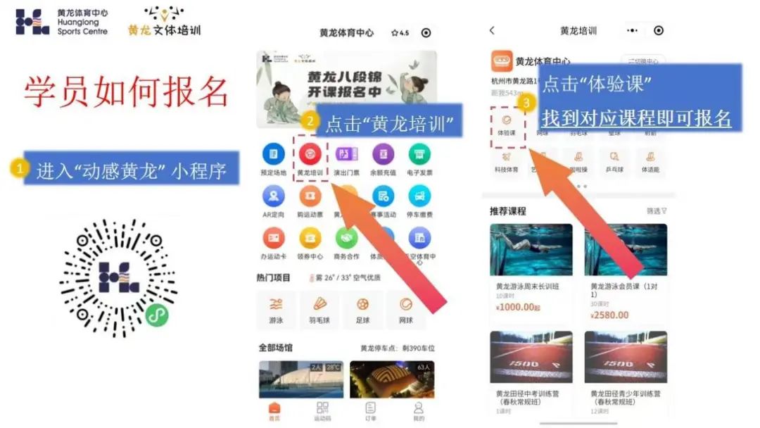 扫描上方“动感黄龙”小程序码报名,具体报名操作流程请详见上图。(课程:网球二班、游泳二班)