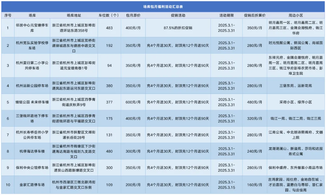 本次停车包月福利活动,涵盖杭州市内10个热门停车场、2721个泊位,惠及周边40余个小区。