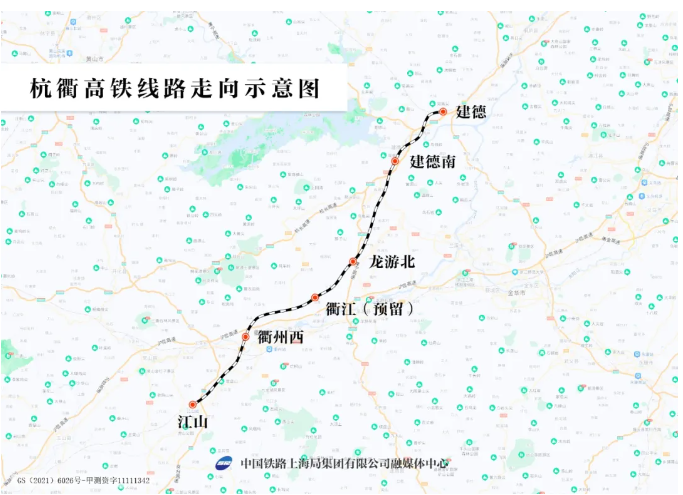 杭衢高铁是浙江省内联通杭州市与衢州市的一条快捷高铁通道,新建正线全长约131公里,设建德、建德南、龙游北、衢江(预留)、衢州西、江山6座车站,设计时速为350公里,桥隧占比达83.7%。预计2025年建成通车。