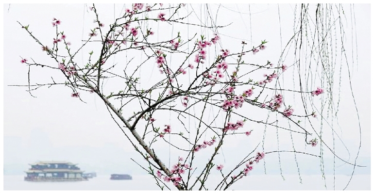 从湖畔望去,蒙蒙细雨中,只见长堤两岸,间株杨柳间株桃,桃花灼灼,柳丝袅袅,春雨如酥,嫣红伴绿,“一株杨柳一株桃”的代表性景观让游客于顾盼之间为之魂牵,氤氲水汽也为这春景增添了一丝朦胧的意境。