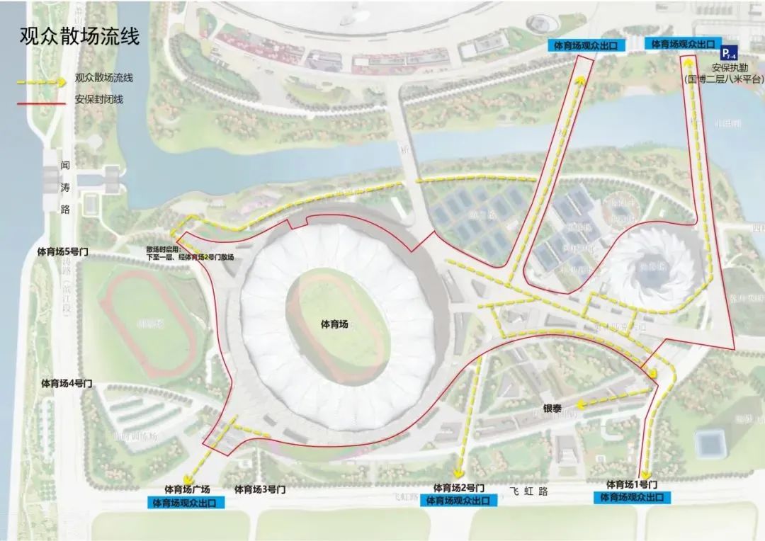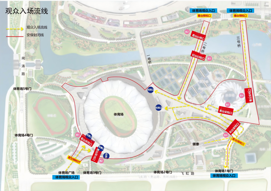 抵达现场的观众,可经由1号门、西广场、2号桥以及3号桥前往体育场入口,有序入场。建议龙之队、长城、中国制躁等有组织的球迷通过3号桥专用通道到达安检口。