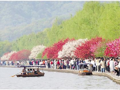 4月5日,浙江省杭州西湖景区游人如织。清明假期,人们走出家门,踏青游玩,乐享美好春光。新华社发(周方玲摄)