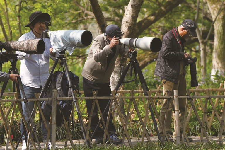 作为生态环境水平走在全国前列的杭州,“打鸟”更是众多摄影爱好者热衷的拍摄活动。在杭州西湖周边的植物园、茅家埠、江洋畈,以及西溪湿地等,他们扛着“长枪短炮”,日夜蹲守,只为一张清晰又生动的鸟类照片。图为在茅家埠芳桂亭拍照的“打鸟”爱好者。
