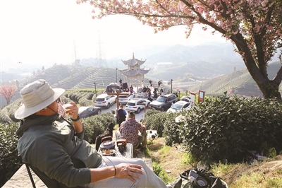 拔山之巅,樱花树下,品茗赏春,好不快哉。 记者 周涛 摄